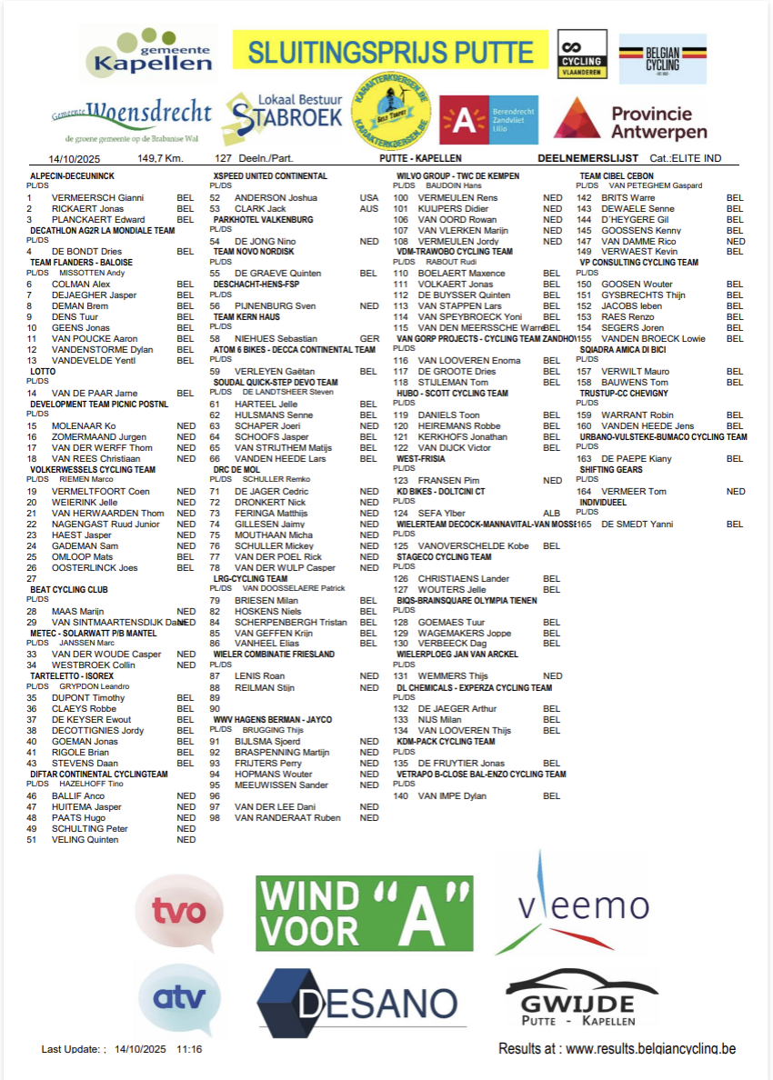 Goedemiddag vanuit Putte-Kapellen in dit live-verslag van de Sluitingsprijs. Hierbij alvast de definitieve deelnemerslijst...